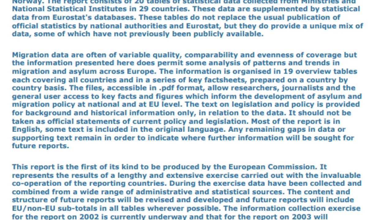 The report provides an overview of migration, asylum, refusals, apprehension and return in 2001, covering all EU Member States, acceding countries, candidate countries as well as Iceland and Norway. The statistics are organised in 19 overview tables each covering all countries and in a series of factsheets, prepared on a country by country Basis.