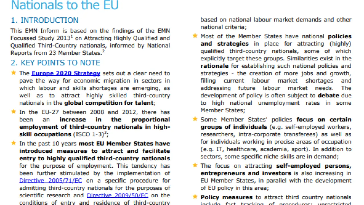 Attracting Highly Qualified and Qualified Third-Country Nationals to the EU Type Inform Category EU-Level Year 2013 Download (EN) Download (DE) Share Facebook X LinkedIn WhatsApp Email The corresponding study to this EMN Inform can be found here.