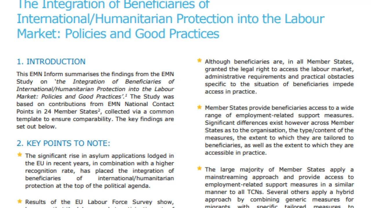 The Integration of Beneficiaries of International/Humanitarian Protection into the Labour Market: Policies and Good Practices Type Inform Category EU-Level Year 2015 Download (EN) Download (DE) Share Facebook X LinkedIn WhatsApp Email The corresponding study to this EMN Inform can be found here.