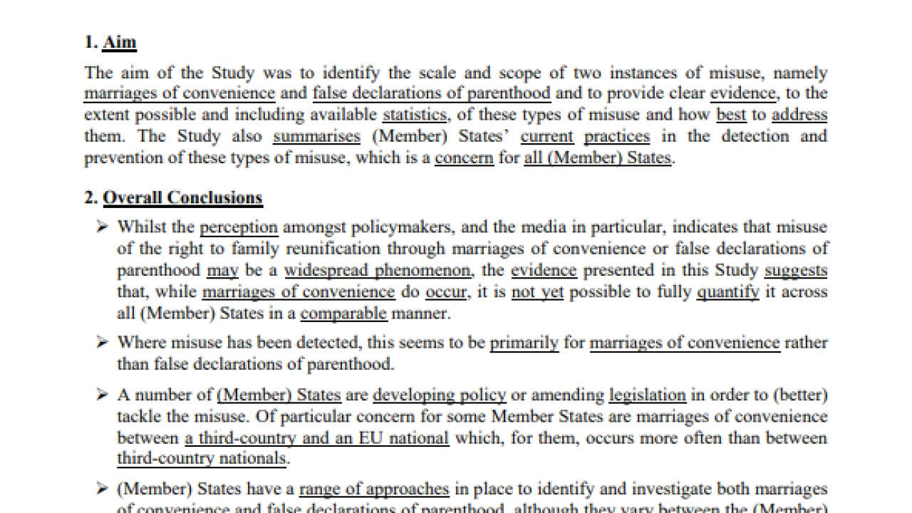 The first EMN Focussed Study 2012 aims to identify the scale and scope of two instances of misuse of the right to family reunification, namely marriages of convenience and false declarations of parenthood.