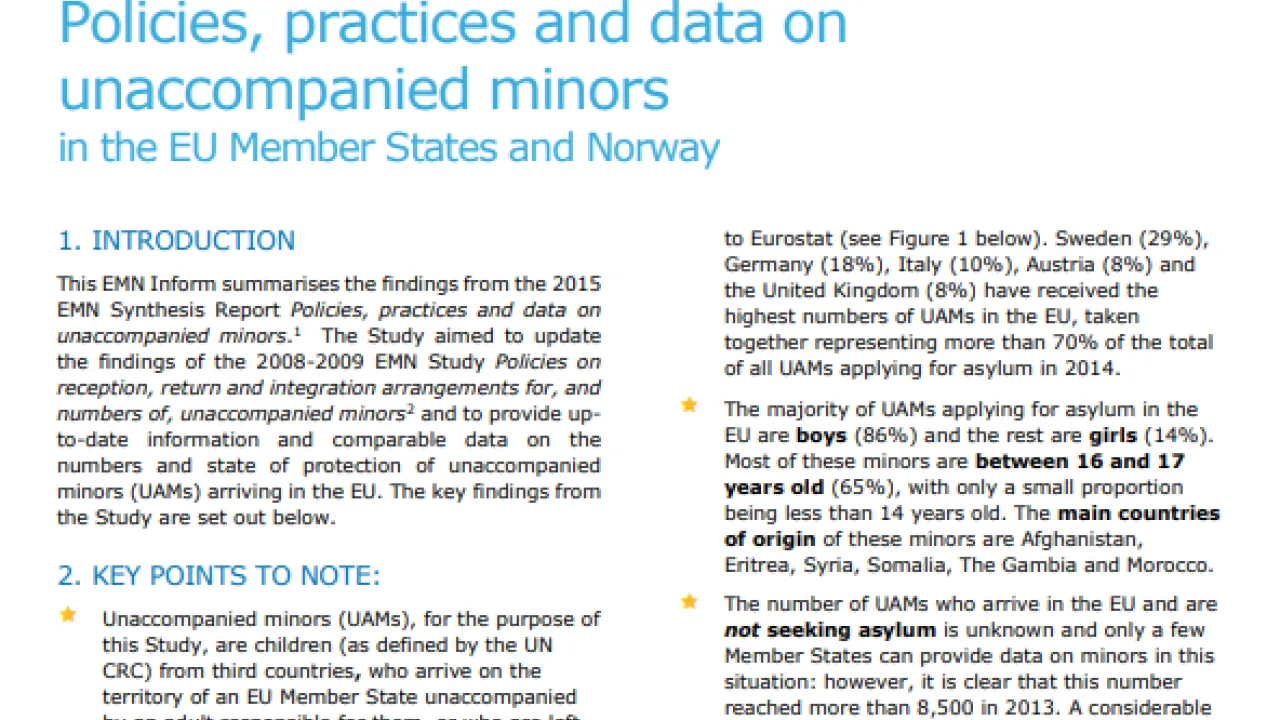 Policies, practices and data on unaccompanied minors in the EU Member States and Norway Type Inform Category EU-Level Year 2014 Download (EN) Download (DE) Share Facebook X LinkedIn WhatsApp Email The corresponding Ad-Hoc Query to this EMN Inform can be found here.