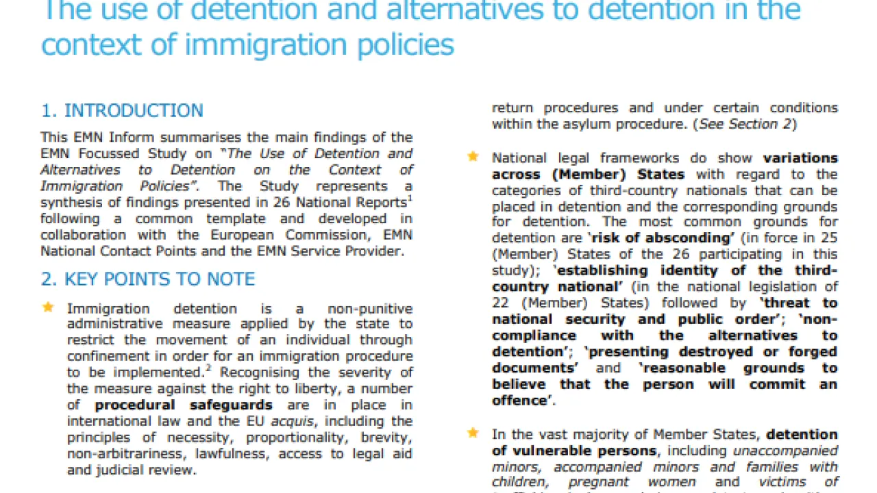 The use of detention and alternatives to detention in the context of immigration policies Type Inform Category EU-Level Year 2014 Download (EN) Download (DE) Share Facebook X LinkedIn WhatsApp Email The corresponding study to this EMN Inform can be found here.