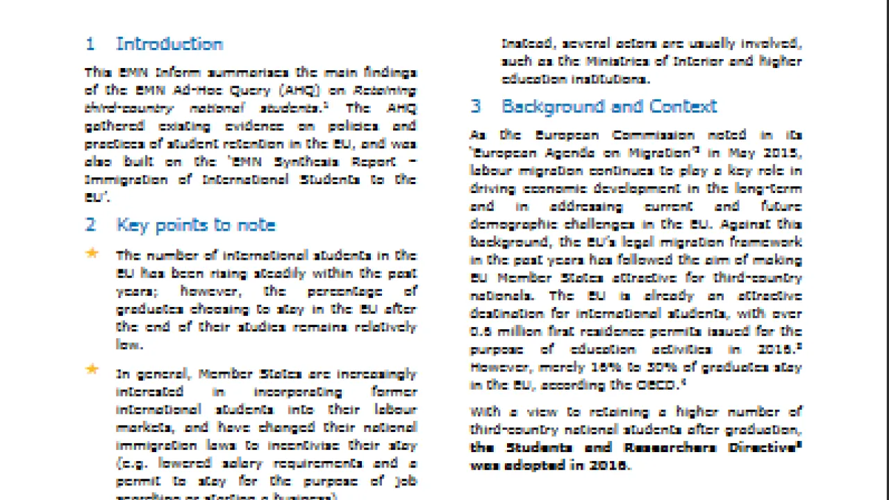 Behalten von Studierenden aus Drittstaaten in der Europäischen Union Typ Inform Kategorie EU-weit Jahr 2018 Download (EN) Teilen Facebook X LinkedIn WhatsApp Email Die entsprechende Ad-hoc-Anfrage zu diesem EMN Inform finden Sie hier.