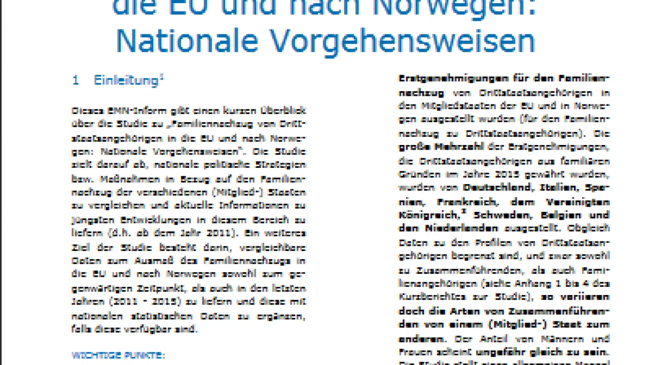 Familiennachzug von Drittstaatsangehörigen in die EU und nach Norwegen: Nationale Vorgehensweisen Typ Inform Kategorie EU-weit Jahr 2018 Download (EN) Download (DE) Teilen Facebook X LinkedIn WhatsApp Email Die entsprechende Studie zu diesem EMN Inform finden Sie hier.