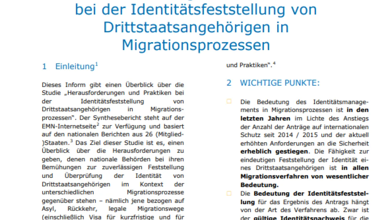 Herausforderungen und Praktiken zur Feststellung der Identität von Drittstaatsangehörigen in Migrationsverfahren Typ Inform Kategorie EU-weit Jahr 2017 Download (DE) Download (EN) Teilen Facebook X LinkedIn WhatsApp Email Die entsprechende Studie zu diesem EMN Inform finden Sie hier.